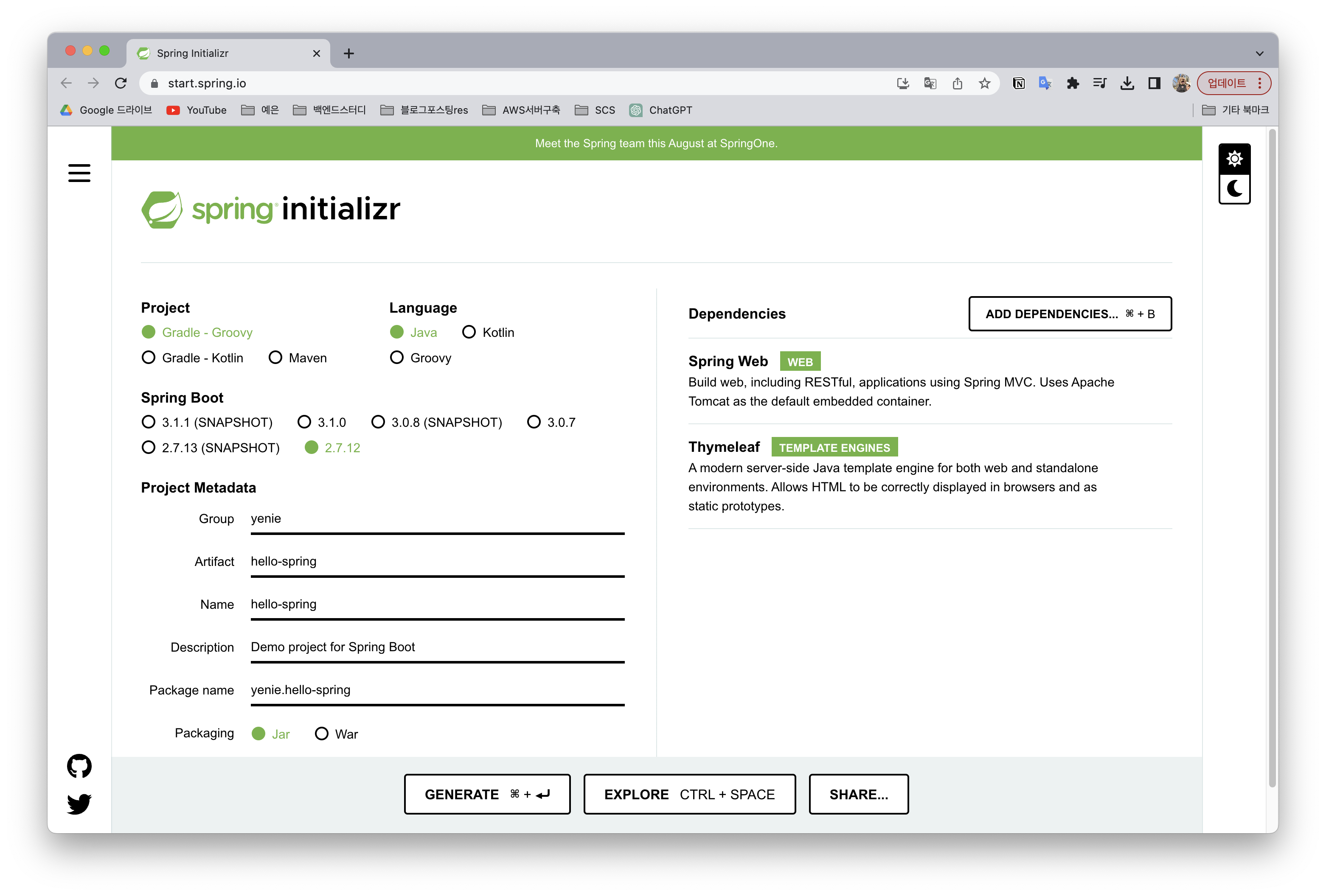 - Spring Boot ) 2.7.12 (미정식 버전을 제외한 최신 버전 사용)