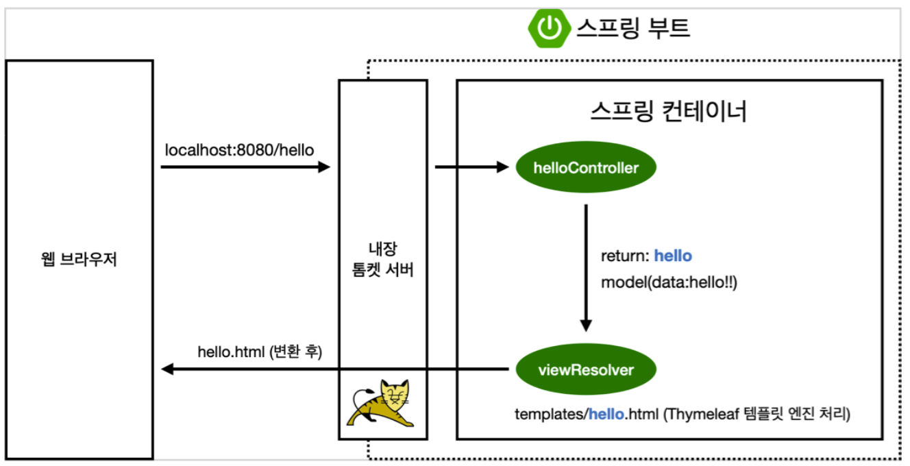 - 컨트롤러에서 리턴 값으로 문자(예제에선 "hello")를 반환하면 뷰 리졸버(viewResolver)가 화면을 찾아서 처리한다