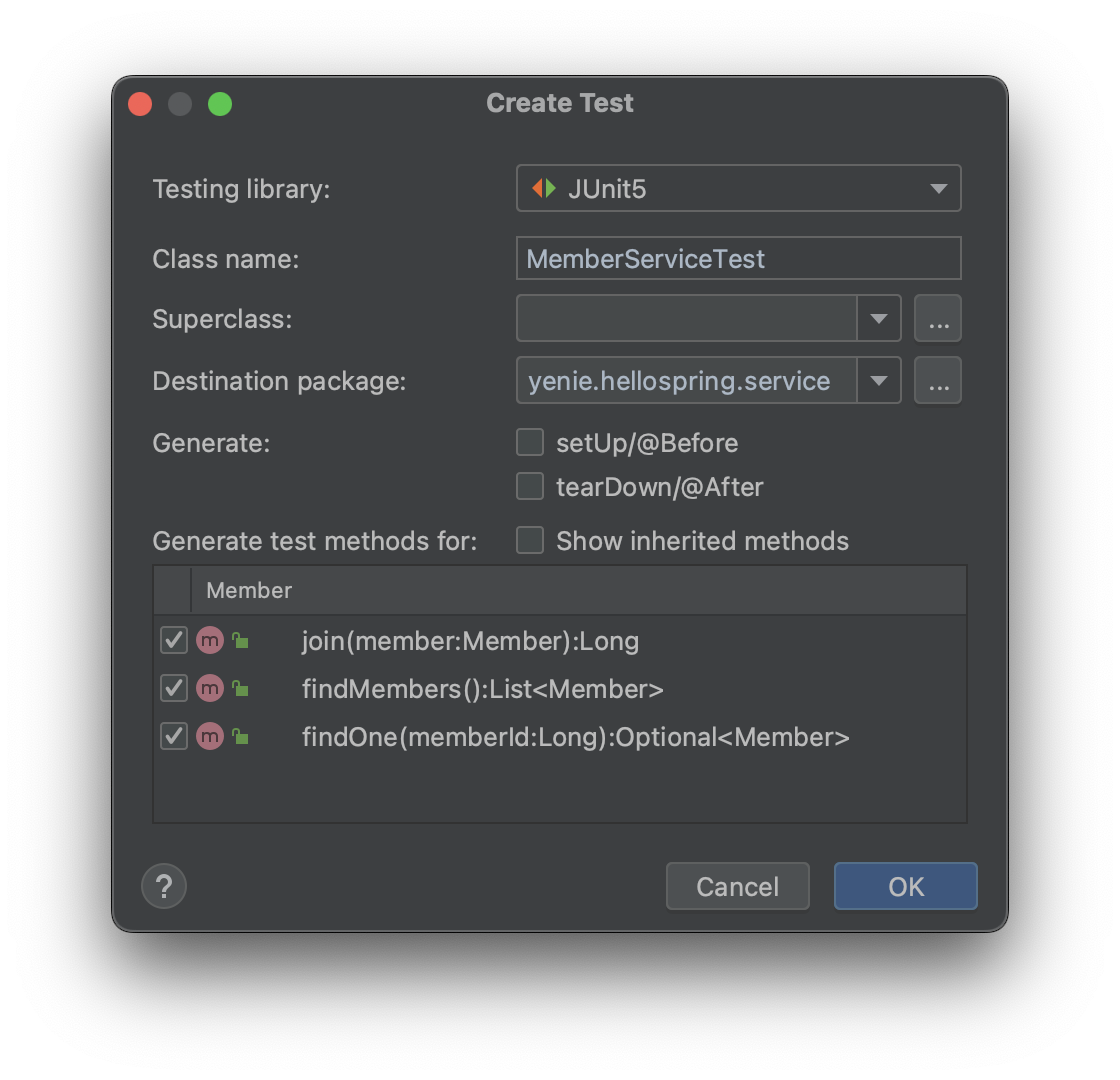 - 테스트를 원하는 메서드들을 체크해주면 된다