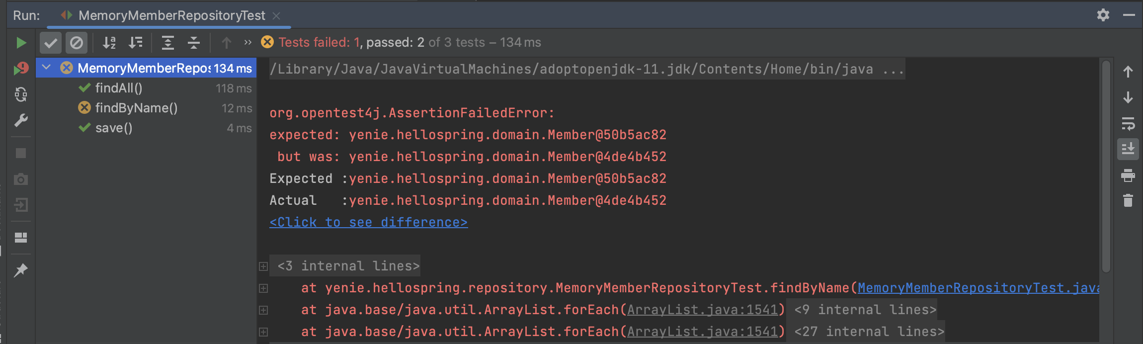- 만약, 예외가 발생하지 않거나, 기대했던 예외가 아닌 경우 해당 테스트는 실패하게 된다.