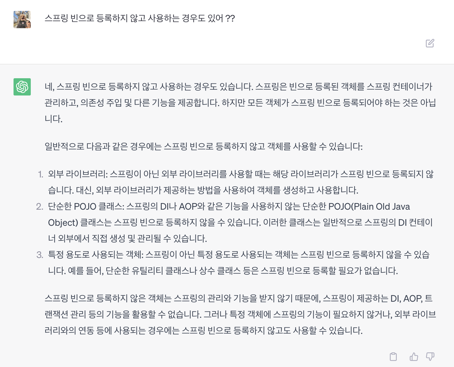 - 모든 스프링 빈이 싱글톤인 것은 아니며, 스코프 설정에 따라 다른 인스턴스를 가질 수도 있다