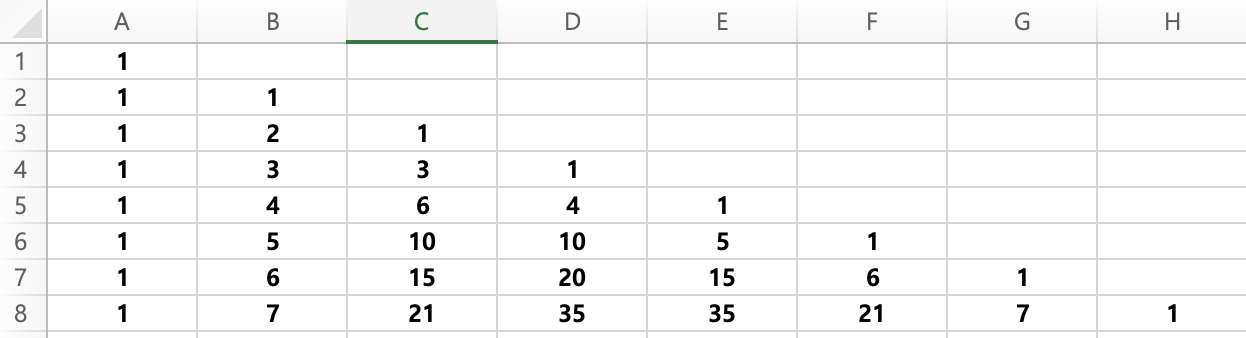 - 파스칼의 삼각형은, x == 0 일땐 무조건 1을 가진다